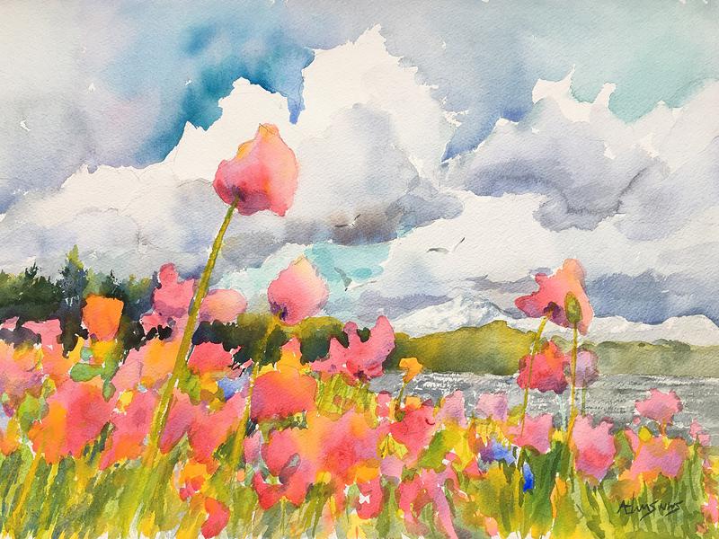 " Poppies by the Bay" 14x22" Watercolor $650